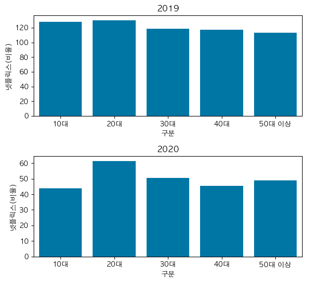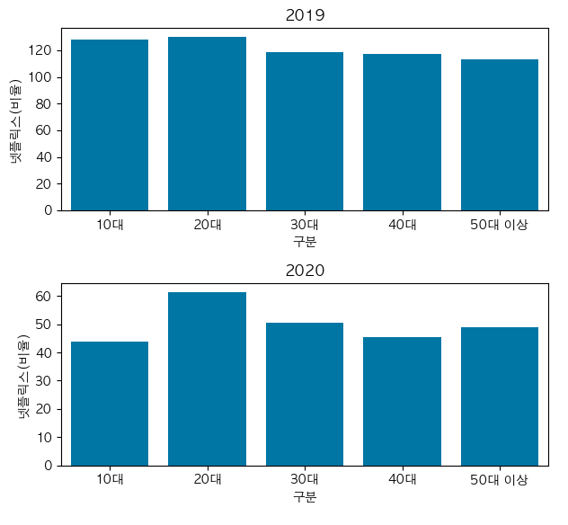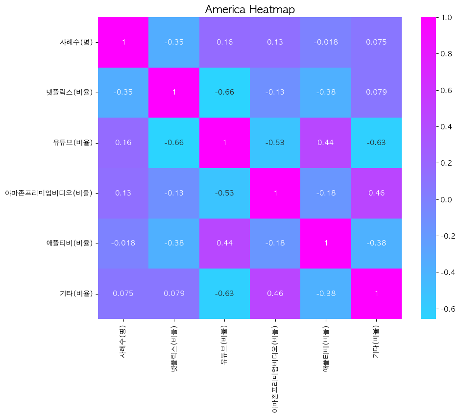 아메리카 넷플릭스는 세계적으로 역시 인기가 있고 아마존프리미엄비디오는 인기가 식고 있는 것을 확인할 수 있다. 유튜브 또한 전연도에 비해 비율이 높아졌다. 넷플릭스 이용 비율과 유튜브 이용 비율 간에 강한 음의 선형관계가 있는 것을 나타냅니다. 넷플릭스 이용 비율이 증가하면 유튜브 이용 비율이 감소하거나, 그 반대의 경우도 성립한다.