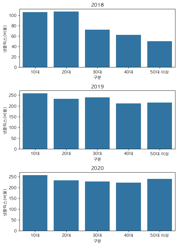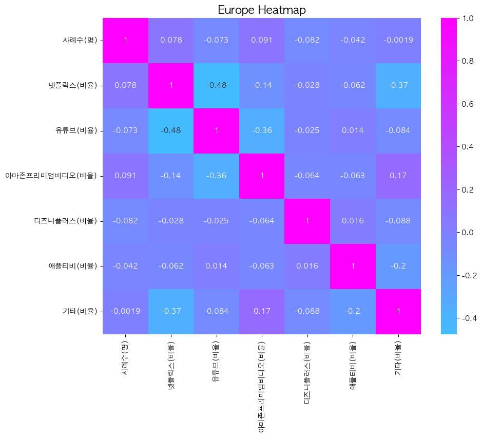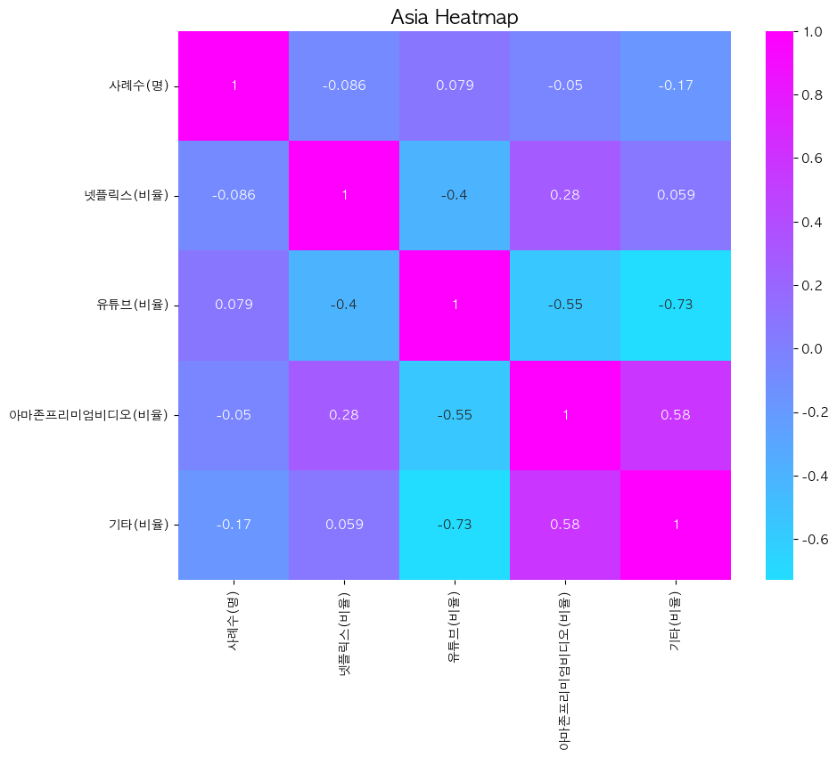 아시아에서는 유튜브와 넷플릭스의 사용 비율이 균형을 이루며 정규 분포를 형성하고 있다. 아마존프라임비디오와의 높은 상관관계는 해당 플랫폼이 다른 기타 OTT플랫폼과 유사한 콘텐츠를 제공할 수 있다고 알 수 있습니다. 반면, 넷플릭스와 유튜브 서로는 음의 선형 관계를 보여주고 있다. 넷플릭스는 10대 사용에서 전년도보다 3배 감소한 반면 유튜브는 동일 연령대에서 인기가 증가하고 있다. 넷플리스보다 유튜브가 더 인기를 끌고 있고 넷플릭스는 나이대별로 전반적으로 감소하는 추세임을 알 수 있다. 분석 결과를 토대로 넷플릭스가 콘텐츠를 강화하거나 마케팅 전략을 더 강화해야 함을 알 수 있다.