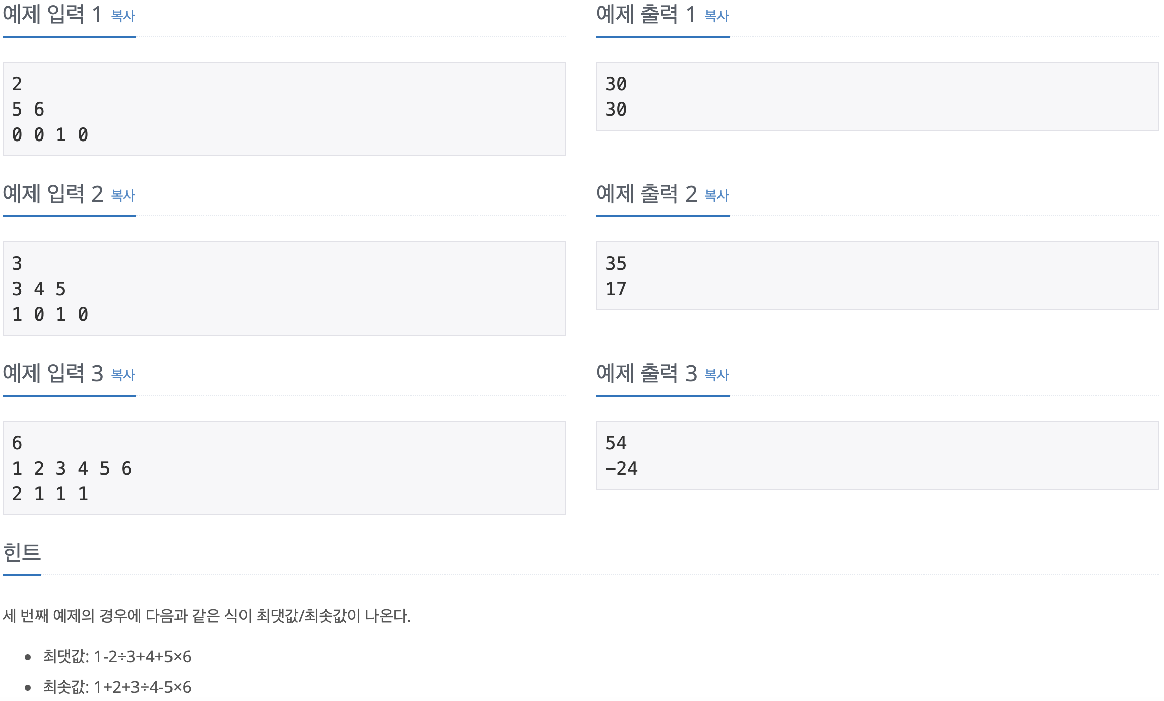 첫째 줄에 만들 수 있는 식의 결과의 최댓값을, 둘째 줄에는 최솟값을 출력한다. 연산자를 어떻게 끼워넣어도 항상 -10억보다 크거나 같고, 10억보다 작거나 같은 결과가 나오는 입력만 주어진다. 또한, 앞에서부터 계산했을 때, 중간에 계산되는 식의 결과도 항상 -10억보다 크거나 같고, 10억보다 작거나 같다.
