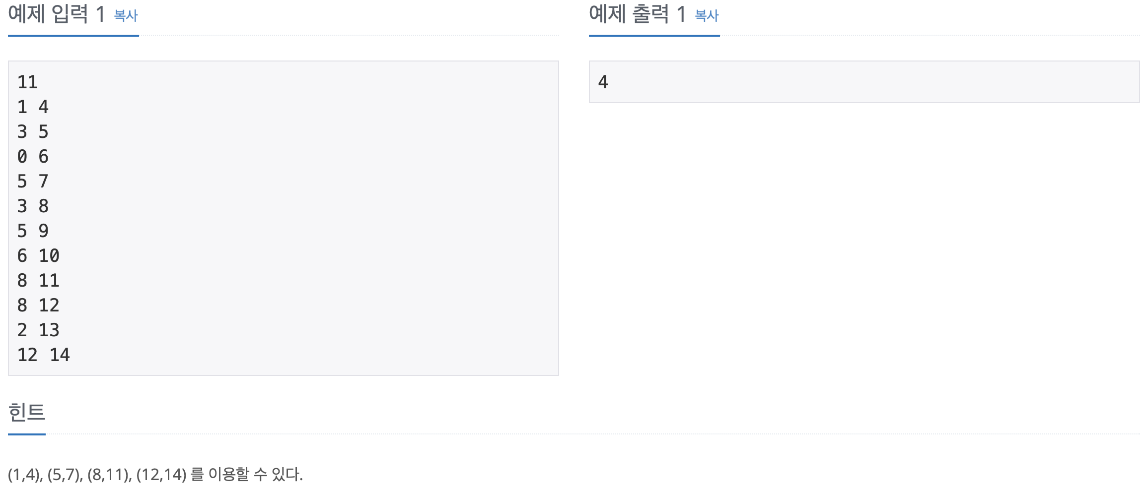 한 개의 회의실이 있는데 이를 사용하고자 하는 N개의 회의에 대하여 회의실 사용표를 만들려고 한다. 각 회의 I에 대해 시작시간과 끝나는 시간이 주어져 있고, 각 회의가 겹치지 않게 하면서 회의실을 사용할 수 있는 회의의 최대 개수를 찾아보자. 단, 회의는 한번 시작하면 중간에 중단될 수 없으며 한 회의가 끝나는 것과 동시에 다음 회의가 시작될 수 있다. 회의의 시작시간과 끝나는 시간이 같을 수도 있다. 이 경우에는 시작하자마자 끝나는 것으로 생각하면 된다.