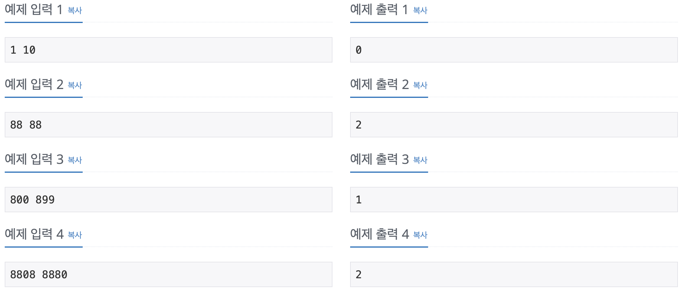 첫째 줄에 L과 R이 주어진다. L은 2,000,000,000보다 작거나 같은 자연수이고, R은 L보다 크거나 같고, 2,000,000,000보다 작거나 같은 자연수이다.