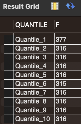 WHEN RNK BETWEEN 2844 AND 3159 THEN 'Quantile_10' END quantile