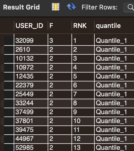 CREATE TEMPORARY TABLE INSTACART.USER_QUANTILE AS