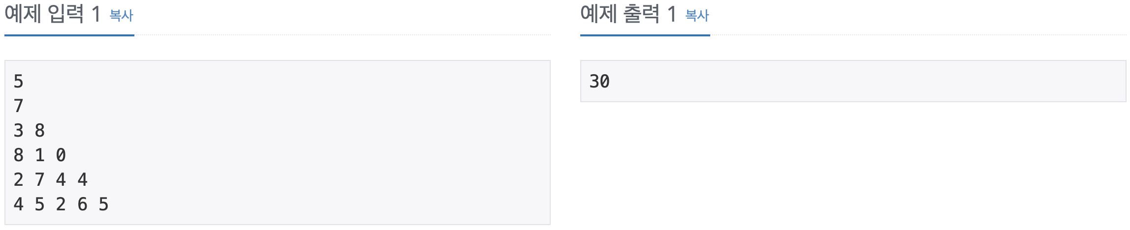 맨 위층 7부터 시작해서 아래에 있는 수 중 하나를 선택하여 아래층으로 내려올 때, 이제까지 선택된 수의 합이 최대가 되는 경로를 구하는 프로그램을 작성하라. 아래층에 있는 수는 현재 층에서 선택된 수의 대각선 왼쪽 또는 대각선 오른쪽에 있는 것 중에서만 선택할 수 있다.