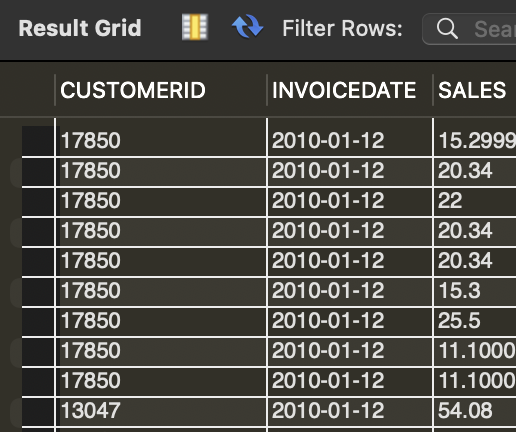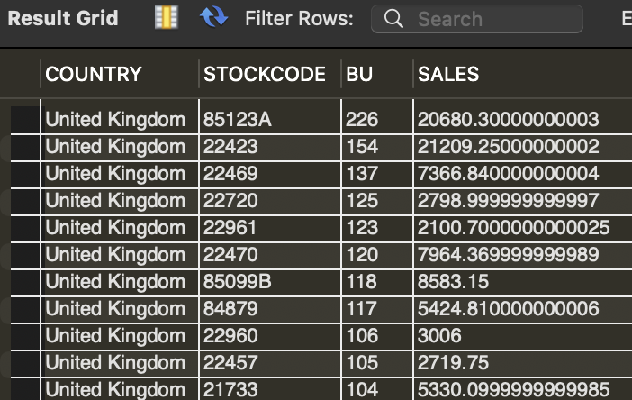 먼저 COUNTRY, STOCKCODE로 데이터를 그룹핑하고, 고객 번호(CUSTOMERID)를 카운트, 구매 상품 수(QUANTITY) * 개당 가격(UNITPRICE)의 곱을 합하면 된다.