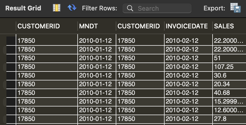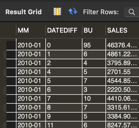 MNDT는 각 고객의 최초 구매 월을 의미하고, DATADIFF는 첫 구매 이후 몇 개월뒤에 구매가 이루어졌는지를 뜻하는 기간을 의미한다. SALES는 해당 기간에 구매한 총 매출액이 된다.