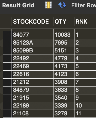 다음으로 판매된 상품 수(QTY)를 기준으로 랭크(RNK)를 생성한다.가장 많이 판매된 2개의 상품을 조회하는 것이 목적이므로 내림차순으로 순위를 매긴다. 위의 쿼리를 SUBQUERY로 만들어 랭크를 생성해 보자.