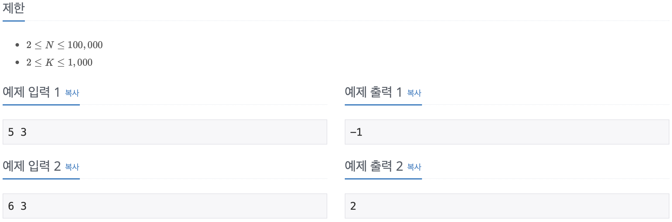 $N$개의 공을 $K$개의 바구니에 문제의 규칙을 만족하면서 나눠 담을 수 있다면, 가장 많이 담긴 바구니와 가장 적게 담긴 바구니의 공의 개수 차이를 출력한다. 나눠 담을 수 없는 경우에는 -1을