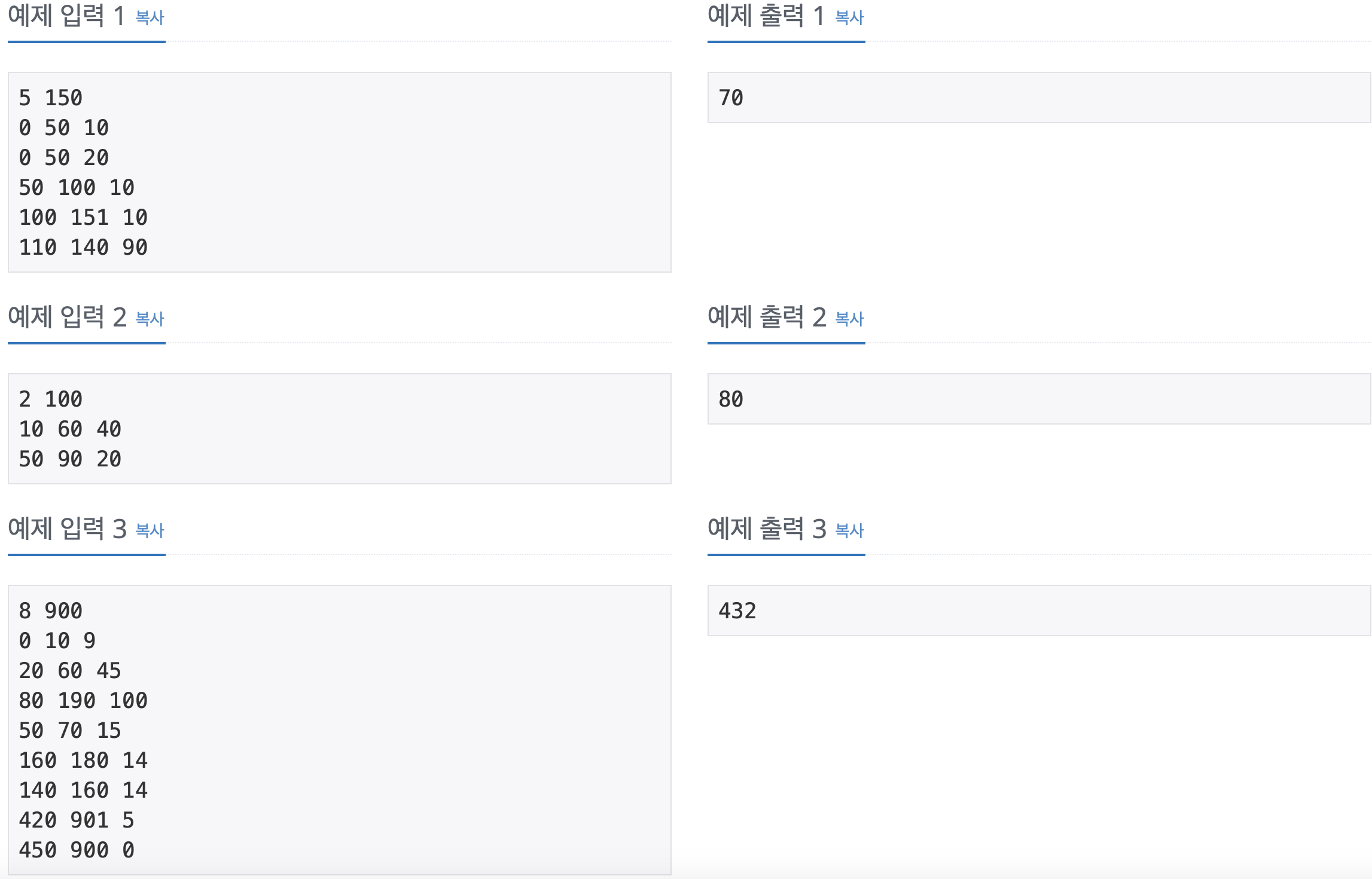 첫째 줄에 지름길의 개수 N과 고속도로의 길이 D가 주어진다. N은 12 이하인 양의 정수이고, D는 10,000보다 작거나 같은 자연수이다. 다음 N개의 줄에 지름길의 시작 위치, 도착 위치, 지름길의 길이가 주어진다. 모든 위치와 길이는 10,000보다 작거나 같은 음이 아닌 정수이다. 지름길의 시작 위치는 도착 위치보다 작다.