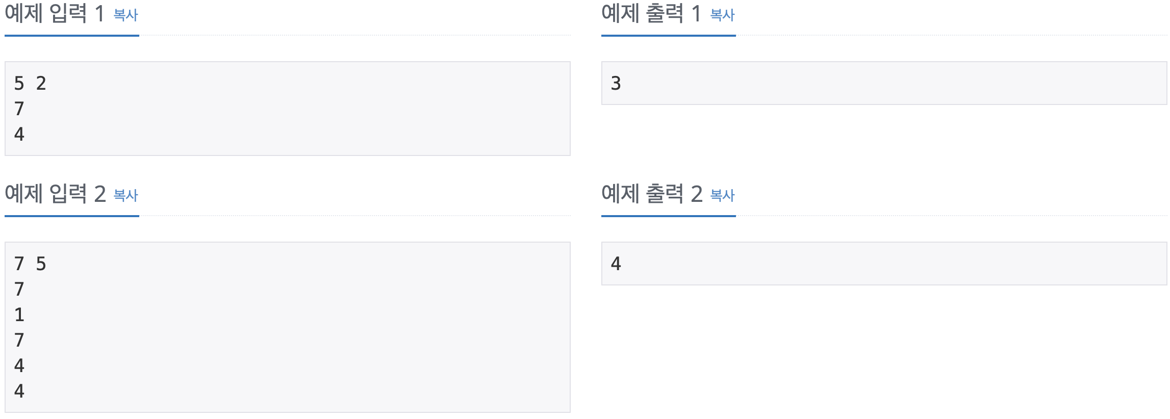 첫째 줄에 아이들의 수 N과 색상의 수 M이 주어진다. (1 ≤ N ≤ 109, 1 ≤ M ≤ 300,000, M ≤ N)
