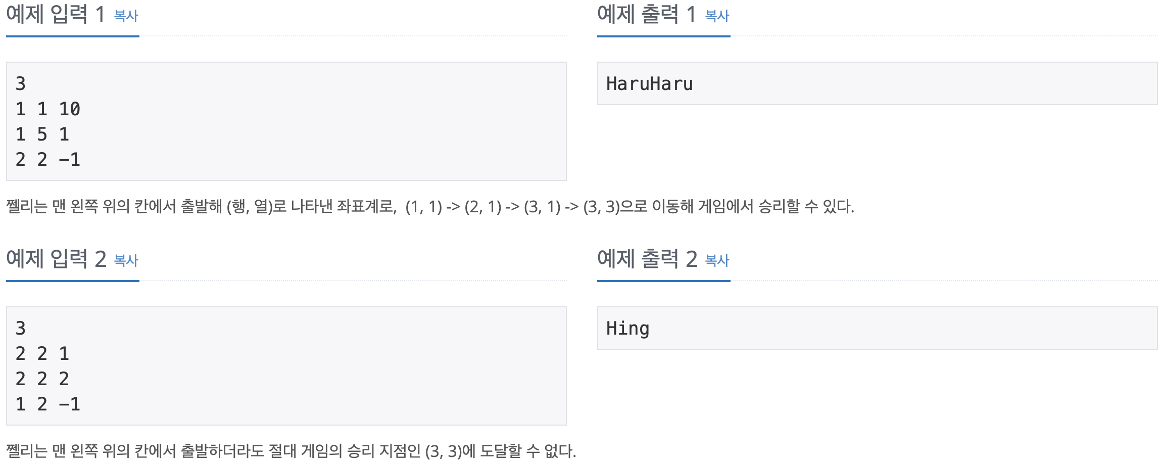 ‘쩰리’가 끝 점에 도달할 수 있으면 “HaruHaru”(인용부호 없이), 도달할 수 없으면 “Hing” (인용부호 없이)을 한 줄에 출력합니다.